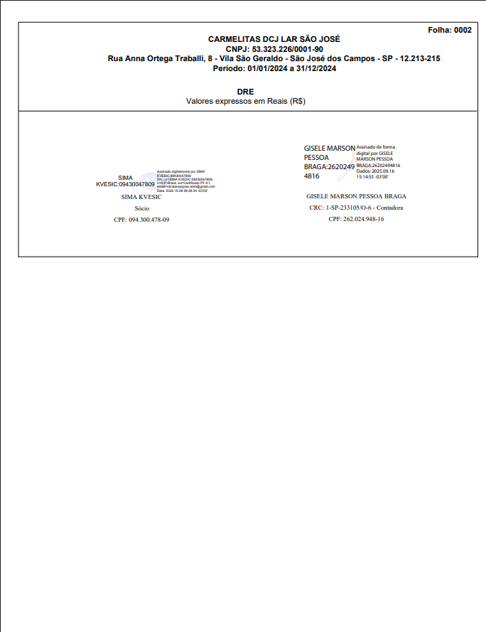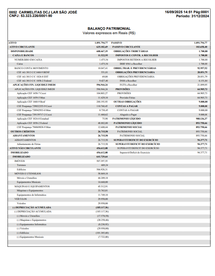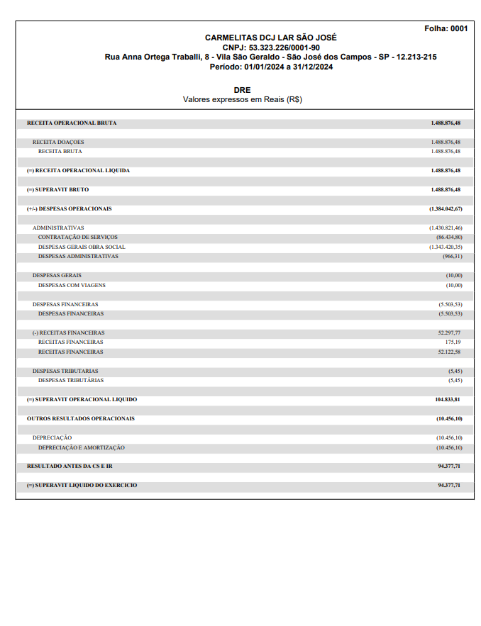 As Irmãs Carmelitas do Sagrado Coração de Jesus, divulgam o balanço do Lar São José, mostrando transparências e seguindo as orientações dos órgãos competentes.