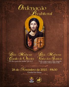 Os primeiros a serem ordenado serão o diáconos Matheus Camilo de Oliveira e Matheus Viana dos Santos, na sexta-feira, dia 28 de novembro, às 19h30, na Catedral São Dimas, em São José. O lema presbiteral escolhido é do Diác. Matheus Camilo é: “Eu Sou a porta das ovelhas” (Jo 10,7) e do Diác. Matheus Viana é “Tudo coopera para o bem daqueles que amam a Deus” (Rm 8,28).